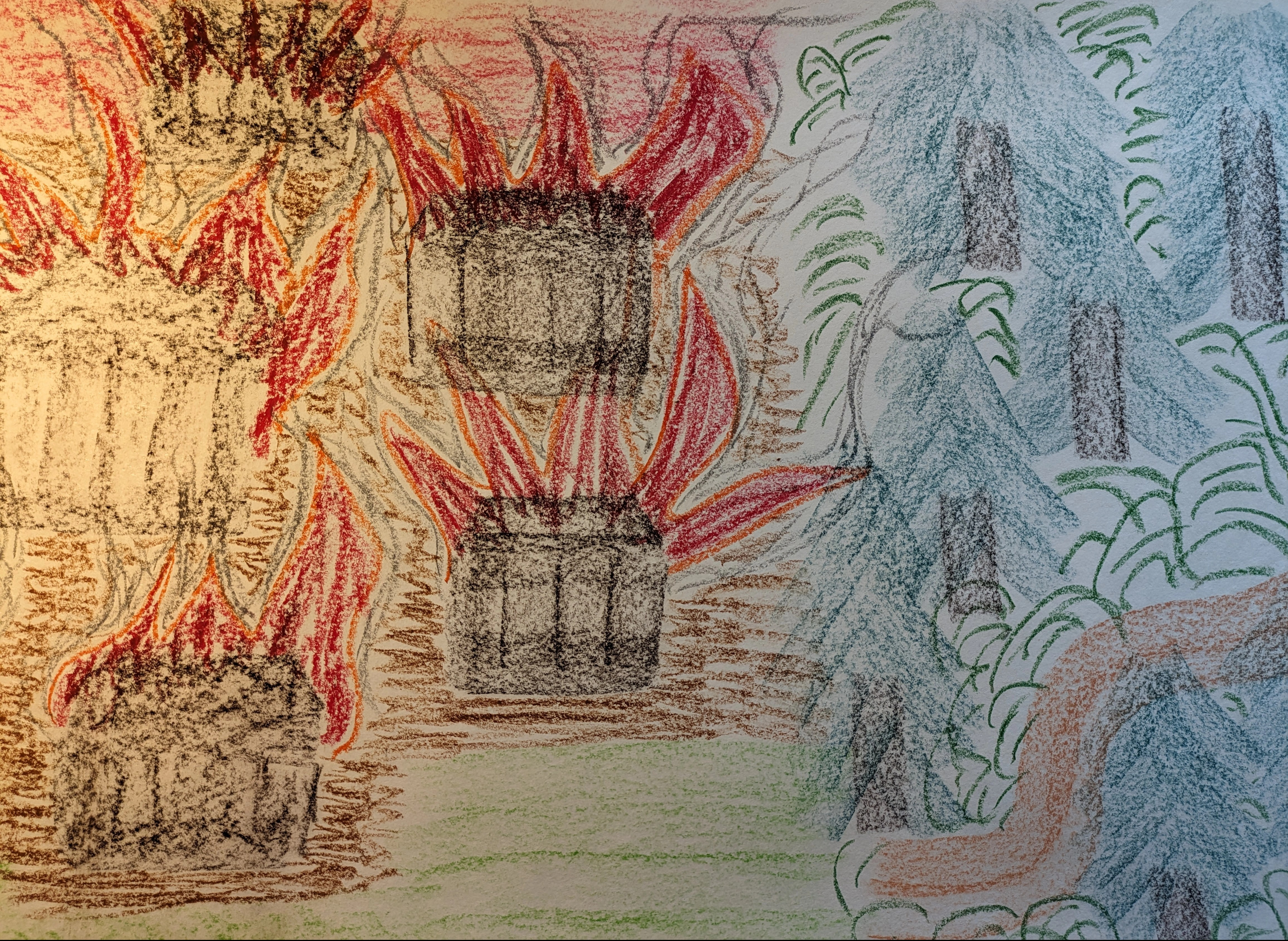So entstand zum Beispiel ein Bild von brennenden Holzhäusern, großen Wäldern und ihrem Weg, den sie zurücklegte, um ein neues Zuhause zu finden. Da gab es oft Hunger, Durst, Kälte und immer wieder Gefahren. Ihr wütender Schmerz hatte auch mit einer bestimmten Art von Männern zu tun, die sich einfach alles nehmen, was sie wollen. Wenn ich mich auf diese Bilder fokussiere, ganz in ihnen eintauche, dann weiß ich, ich war da, obwohl das mit meinem aktuellen Leben gar nichts zu tun hat.