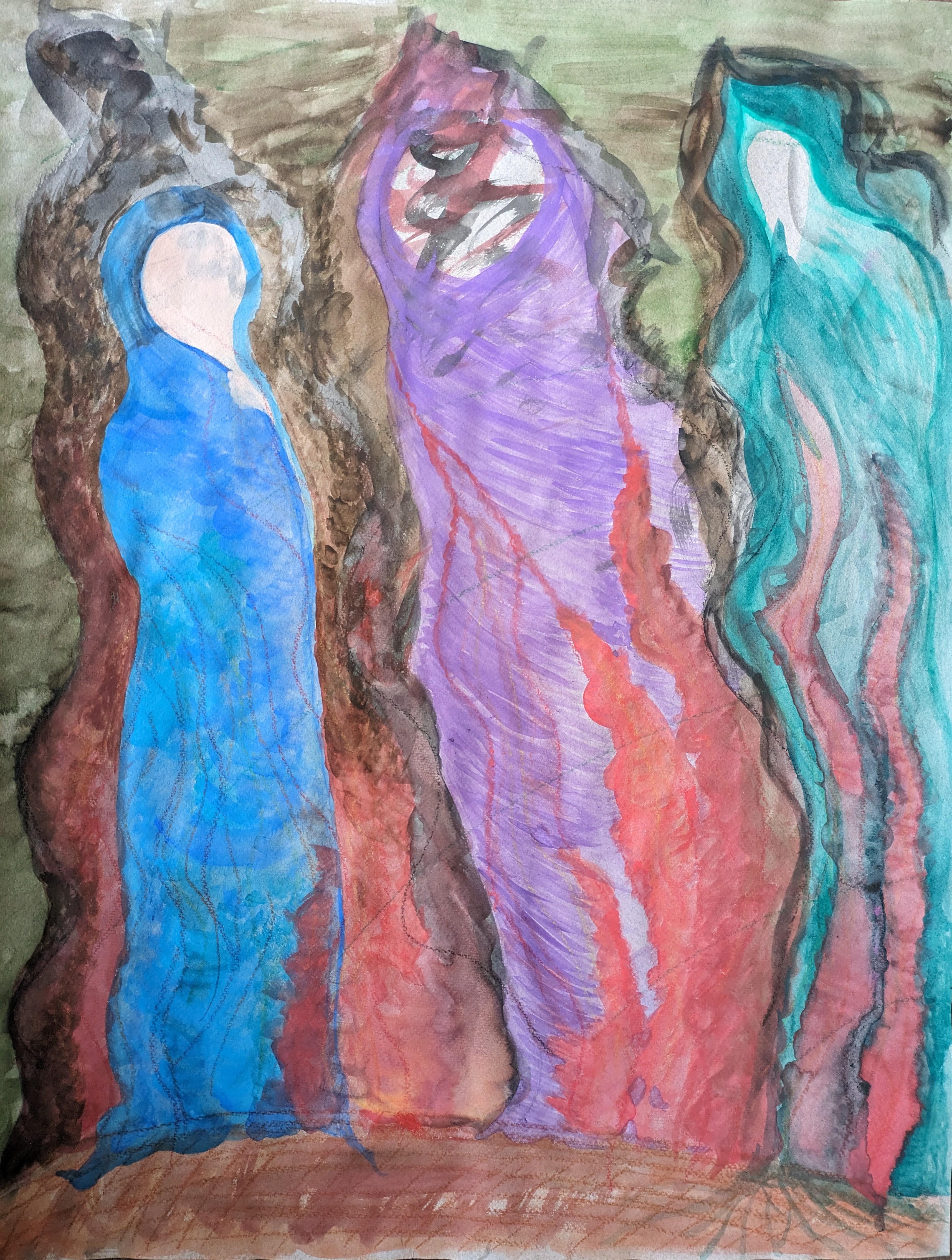 Die Erforschung dieser Frauen begleitet mich schon seit mehreren Jahren. Innere Personen tiefer kennenzulernen, hat für mich zu Beginn auch ein Gefühl von einer fiktiven Geschichte. Da gibt es in mir diese verschiedenen Anteile, die andere Lebenserfahrungen tragen als die, die mich als Ganze ausmachen. So fand die Lebensgeschichte meiner Kriegerin in einer anderen Zeit und an einem anderen Ort statt. Sie hatte ihre Heimat durch einen Überfall verloren. Ihre Erlebnisse entfalteten sich vor allem in Form von gemalten Bildern.